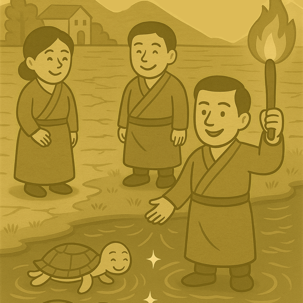 柴胡村民举起光亮的火炬,驱散沉闷的气息,让阳光洒满湖面。他的力量升阳解郁,湖水波光粼粼,百龟们精神焕发,重新自在地游动。