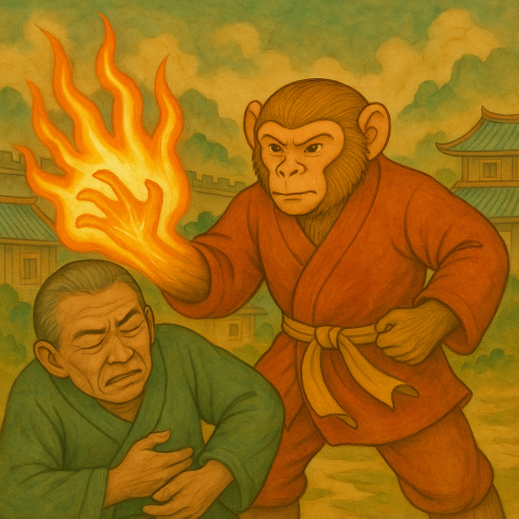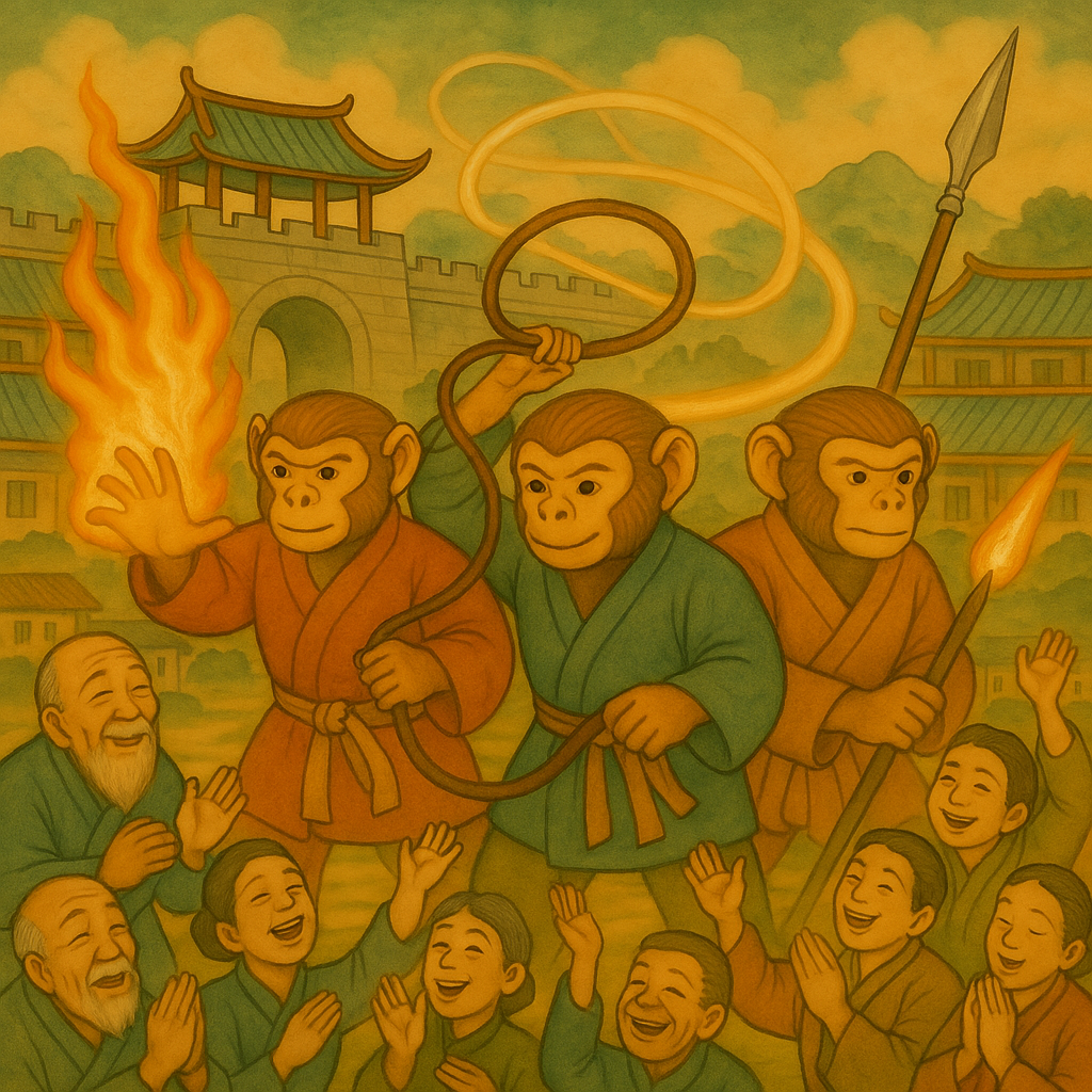三位黄猴齐聚六腑城,联手施展通降神技——猛爪一扫,疏通腑气;神鞭挥舞,行气化痰;破空矛闪耀,除痞化积。顷刻之间,六腑城的瘴气消散,百姓们恢复健康,街道上重新回荡着欢笑与安逸。
